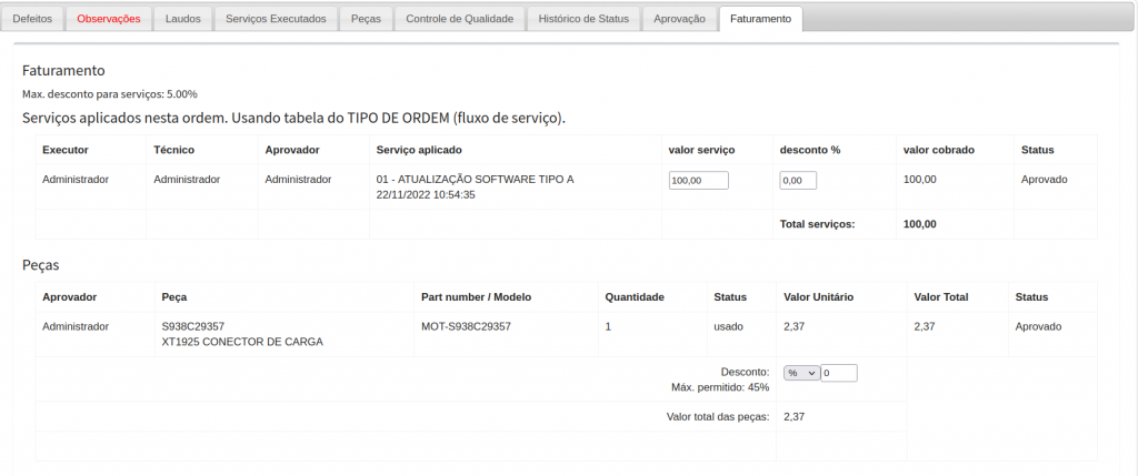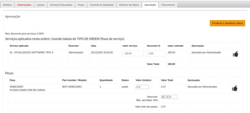 Confira as informações e realize a aprovação do serviço prestado e do produto utilizado na ordem de serviço.