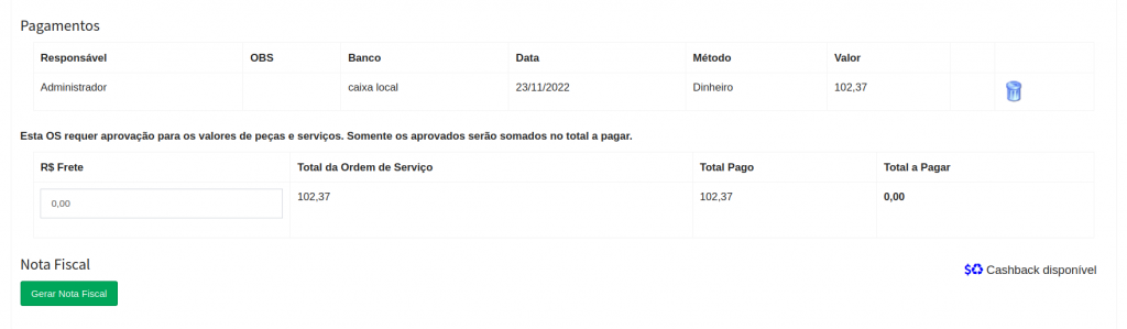 É possível emitir nota fiscal, clicando no botão Gera nota fiscal.
