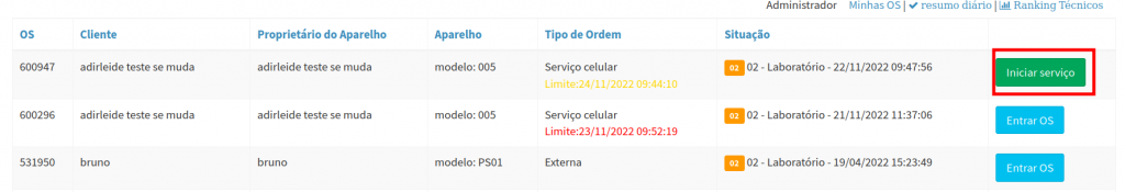 10. Busque a O.S e clique em Inciar serviço.