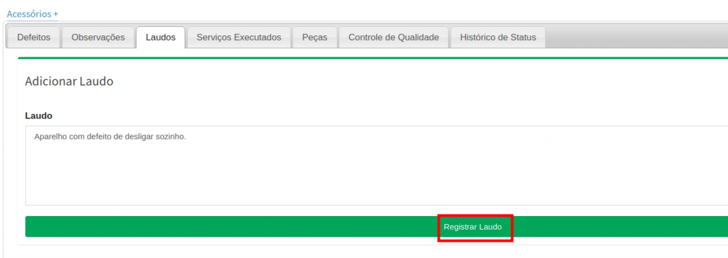 preencha as informações do laudo e clique em Registrar Laudo.