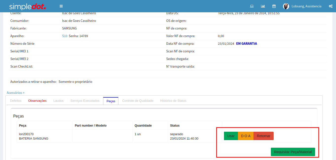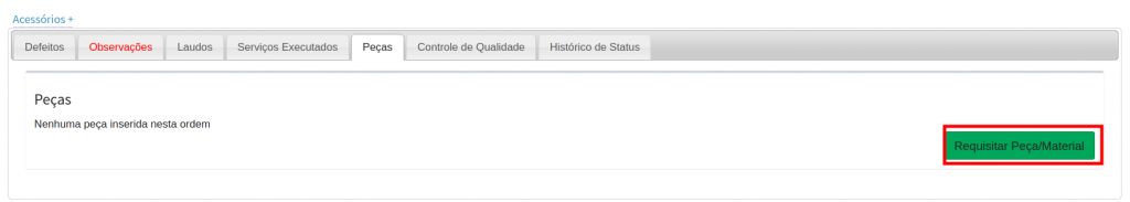 Clique no botão Requisitar Peças/ Material, para inserir o produto ou peça utilizado na prestação de serviços.