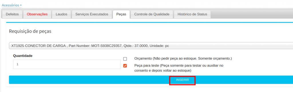 Observação: Para solicitar uma peça ou material para prestação de serviço,após inserir na ordem de serviço você precisa fazer a requisição no módulo Estoque seguido de Requisições de peças.