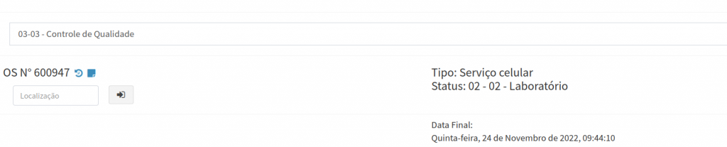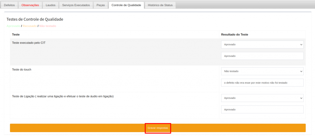 Na aba controle de qualidade só vai aparecer as informações para preencher após alterar o status para Controle de Qualidade.