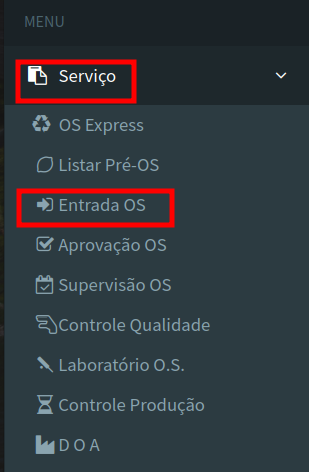 - No menu principal , acesse o módulo Serviço, seguido por Entrada de Ordem de Serviço.