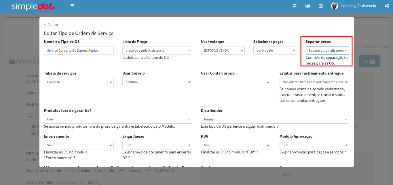 Ou configurar no Editar Tipo de Ordem de serviço ex: como Separar automaticamente para dar baixa direto do estoque e o técnico já utilizar a peça ou retornar.