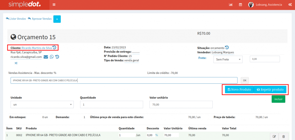 Ao realizar uma nova venda para o cliente, e ao fazer a busca do produto se este produto já estiver cadastrado para este cliente, o sistema vai está exibindo as opções de cadastrar Novo produto ou Repetir produto que foi cadastrado para o cliente.