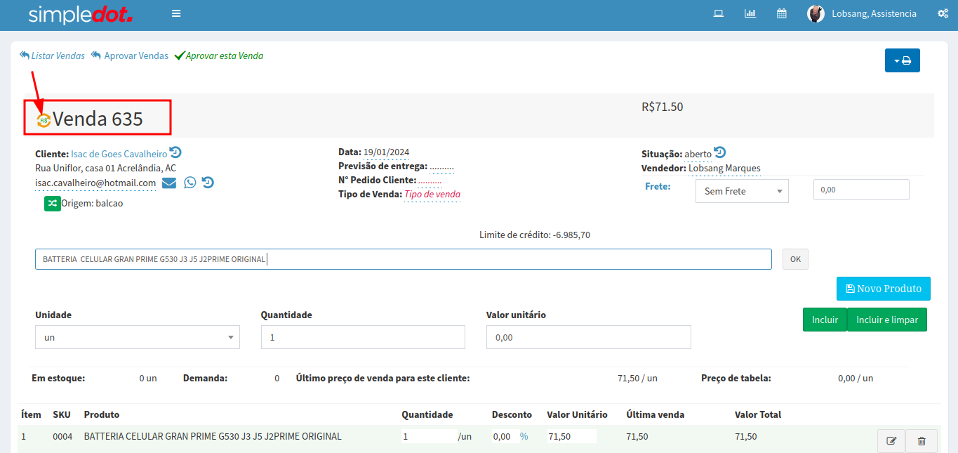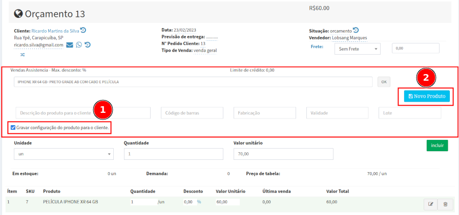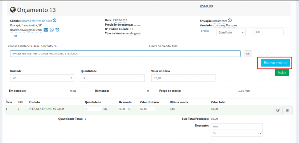 Após inserir os dados do cliente, e realizar a busca do produto escolhido, o sistema disponibiliza a função Novo Produto onde pode ser gravado este produto específico para o cliente.
