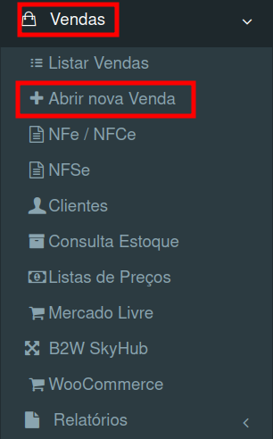 . Na tela inicial, acesse no menu principal Vendas e depois clique em Abrir nova Venda.