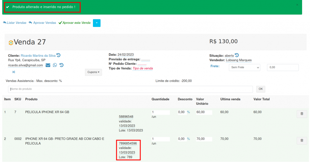 Após realizar as devidas alterações o sistema exibi uma notificação informando que o ( produto foi alterado e inserido no pedido) e exibe as alterações feita no produto.
