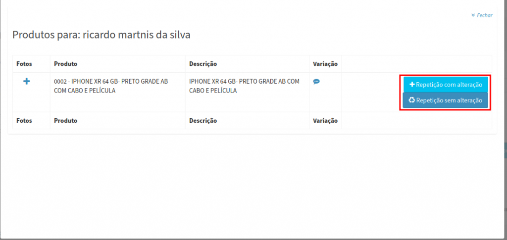 Ao clicar em Repetir produto você tem as opções de Repetição com alteração (para repetir o produto no pedido e fazer alguma alteração) ou Repetição sem alteração ( para repetir o produto no pedido e não fazer nenhuma alteração).