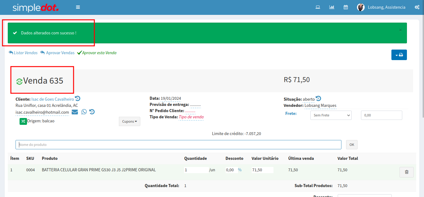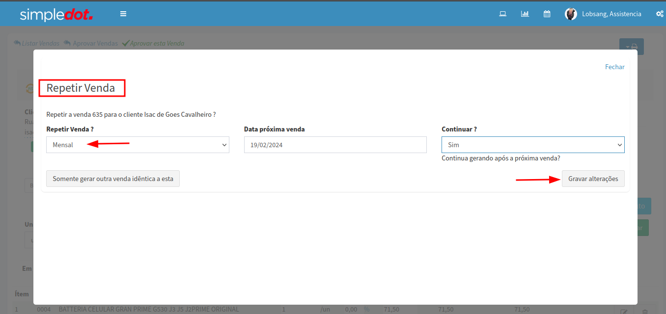 Ja gravada a venda recorrente a cor laranja da venda muda para verde e a informação que os dados ja fora alterados com sucesso!