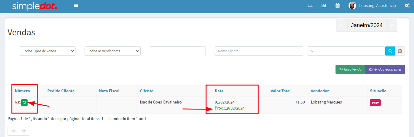 Gerando assim um símbolo de recorrente no numero da venda e agendando a próxima como no ex: Prox:19/02/2024.