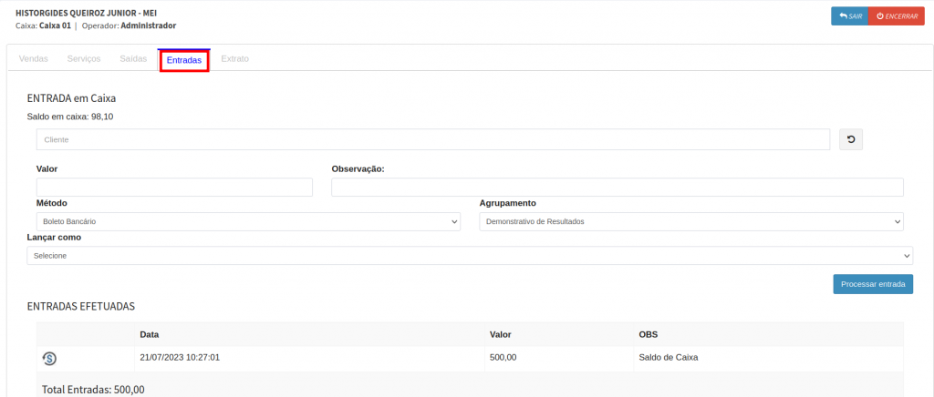 3. Na tela Vendas são exibidas as informações das suas vendas. Vá até a aba Entradas para inserir o saldo inicial do caixa.