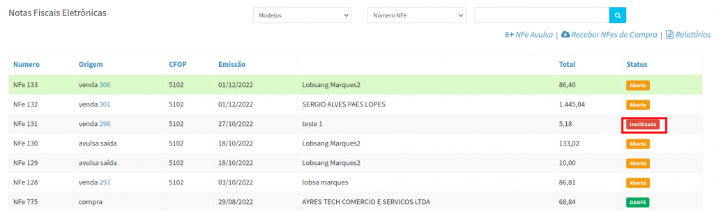 5. Após registrar a inutilização da nota, a situação ficará como Inutilizada.