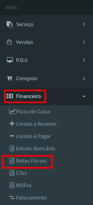 - No menu principal, localizado na barra lateral esquerda, clique na opção Financeiro seguido de Notas Fiscais.
