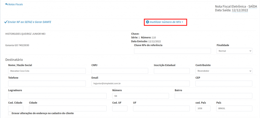 Após descrever, clique em Inutilizar número.
