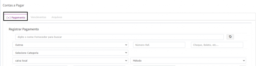 - Para realizar um lançamento de pagamento no contas a pagar, acesse o menu Financeiro na opção Contas a Pagar.