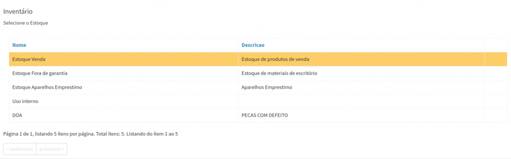3. Na tela Listar estoques, selecione o estoque de origem ao qual será feita a movimentação.
