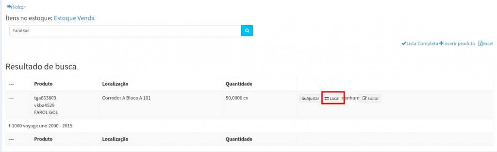 4. Você sera direcionado para tela de Itens no estoque, busque o produto que deseja transferir de estoque e clique em Local.