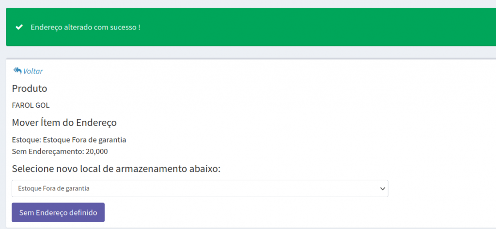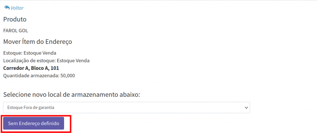 5. Na tela transferência de estoque informe o estoque de destino que será transferido o produto. Caso o estoque de destino tenha alguma localização informe em qual localização este produto será armazenado, se não tiver localização após selecionar o estoque clique em Sem endereço definido.