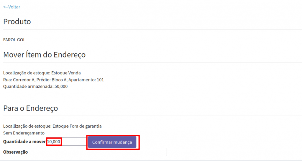 6. Você será direcionado para tela de Produto, onde ira informar a quantidade que deseja transferir e alguma observação, em seguida clique em Confirmar mudança.
