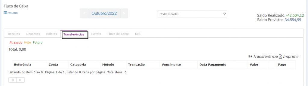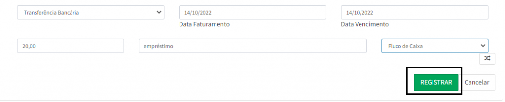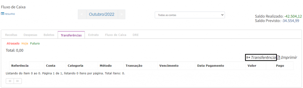 3. Para cadastrar uma transferência, clique na opção Transferência.