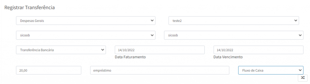 4. Na tela de Registrar Transferência, preencha as informações solicitadas.