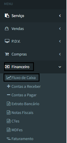 - Para realizar uma transferência entre contas, acesse o menu Financeiro na opção Fluxo de caixa.