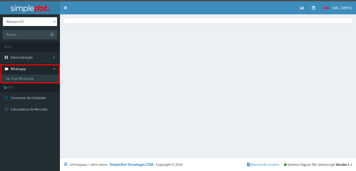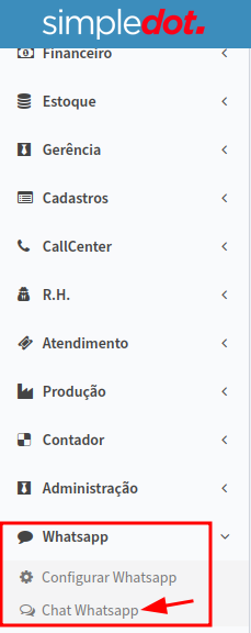 Após configurado, acesse o menu e novamente e clica em Chat WhatsApp para fazer a sincronização com o seu numero.