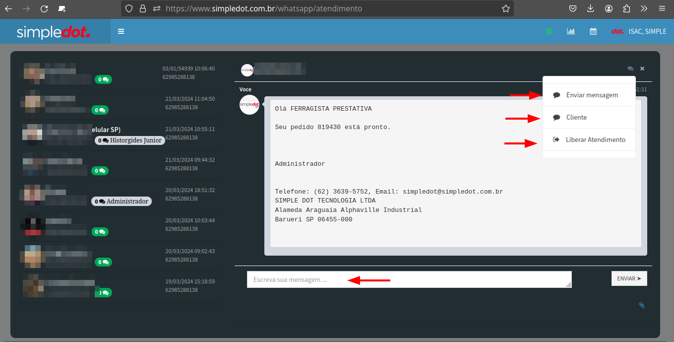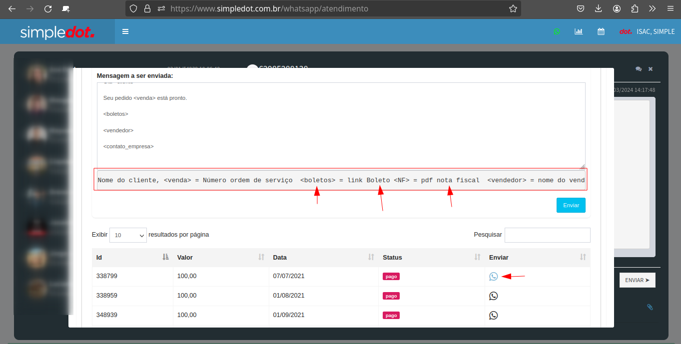 Para sua integração do WhatsApp entre em contato com o nosso Financeiro para solicitar o serviço e passe seu numero para fazer o cadastro junto a empresa que gerencia as mensagens e acertar valores da integração com a API.