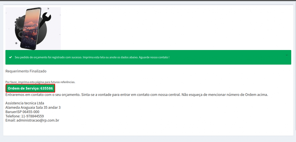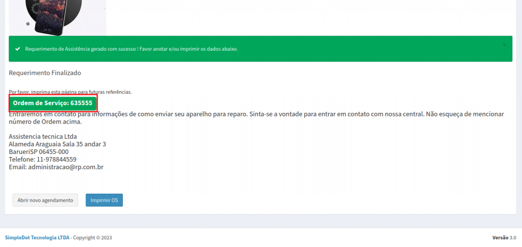 Requerimento de Assistência gerado com sucesso ! Favor anotar e/ou imprimir os dados abaixo.