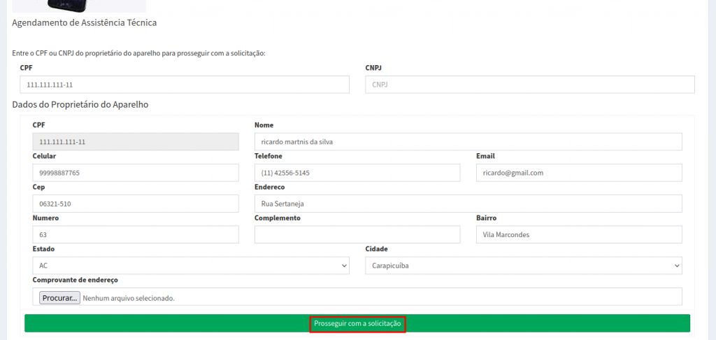 Você sera direcionado para tela de Agendamento de Assistência Técnica, podendo já inserir o CPF do cliente ou CNPJ da Empresa. Se o cliente não estiver cadastro favor completar os dados abaixo e clicar no botão “prosseguir”