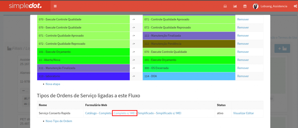 Em tipos de ordem de serviços ligadas a este fluxo em Formulários Web, em seguida selecionar Completos s/IMEI.