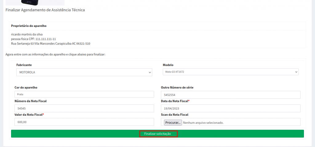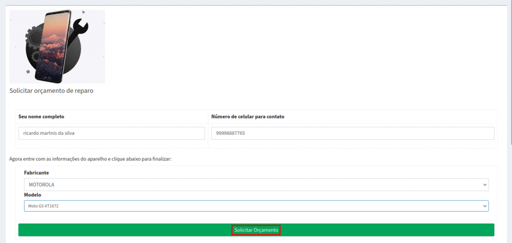 Agora entre com as informações do aparelho e clique abaixo para finalizar: