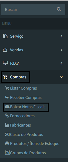 1. Acesse o Menu Principal, que está localizado no canto esquerdo da tela e selecione a opção Compras.