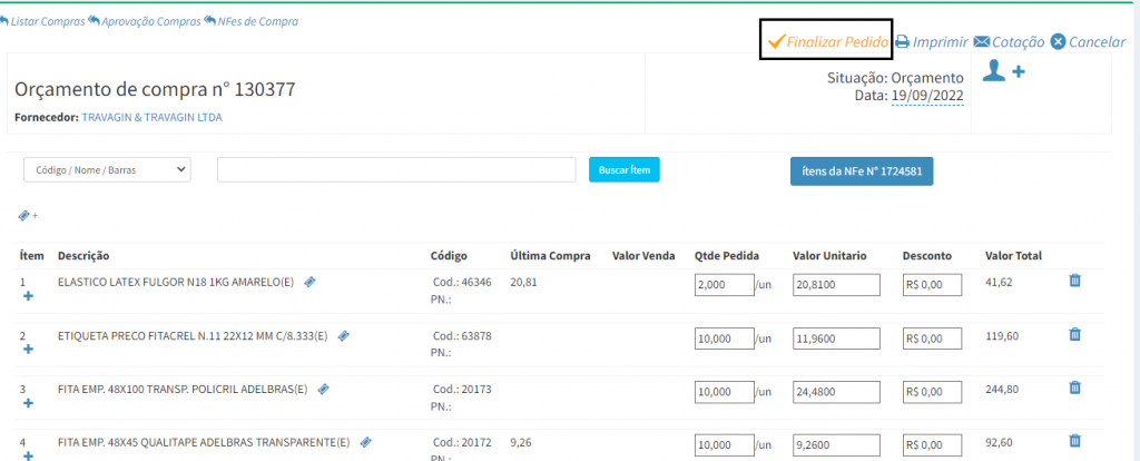 Para gerar atividade no financeiro e estoque, é necessário Gerar o pedido de Compra.