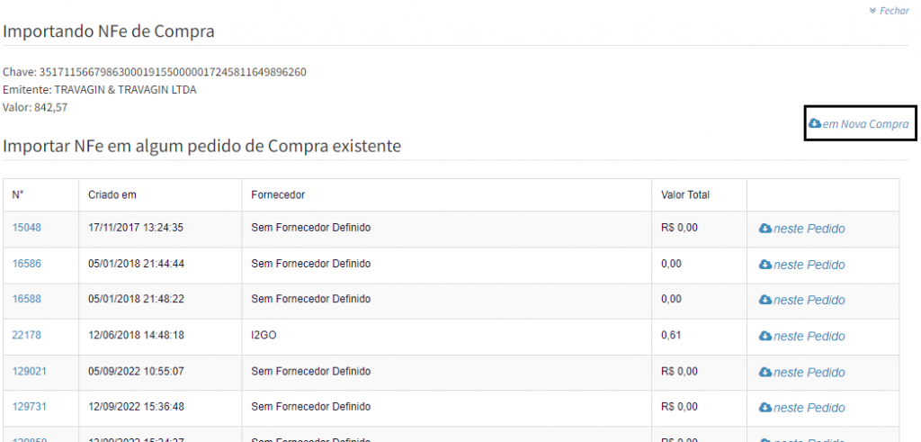 Em seguida o sistema ira te direcionar para a tela de Gerar o pedido de compra, clicando em Nova Compra.