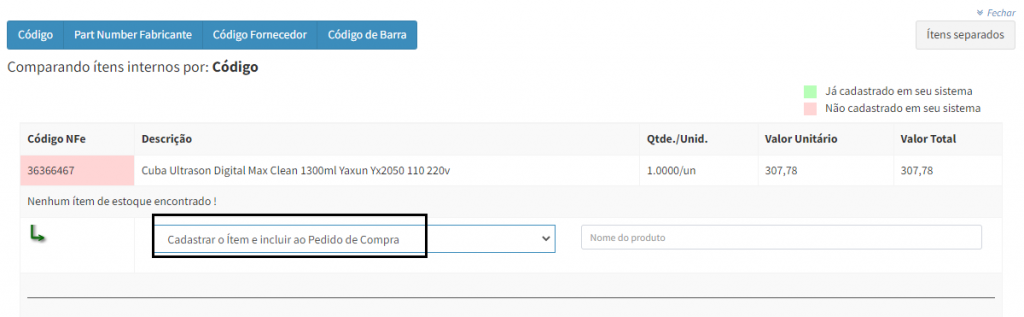 Caso tenha algum produto sem cadastro, clique na barra de cadastro e selecione a opção Cadastrar o item e incluir ao Pedido de Compra.