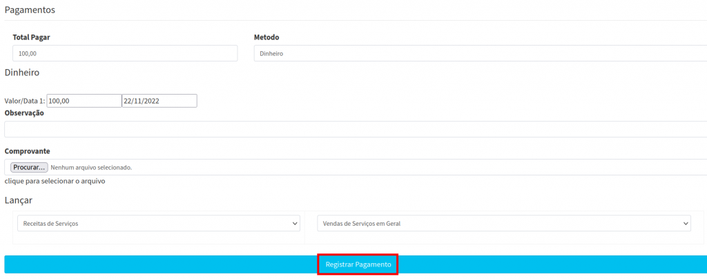 8. Em pagamento informe o valor do serviço, forma de pagamento, plano de contas e vencimento.