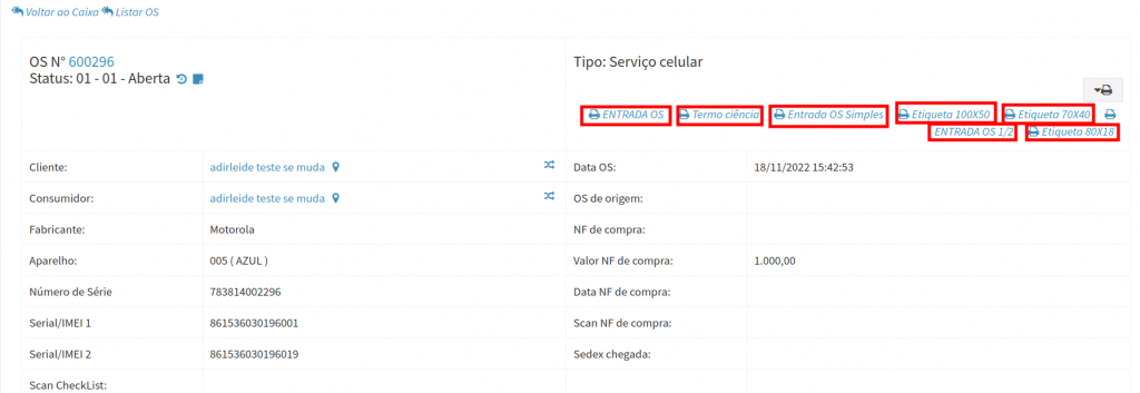 Após a abertura da O.S, o sistema exibe alguns tipos de impressão, clicando no ícone da impressora: