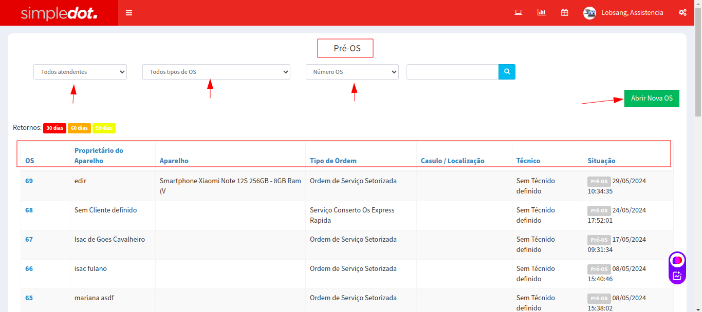 2 – Podendo abrir uma nova O.s ou verificar outras Pré-Os que estão sem técnicos definidos, tipos de ordem ou Situação para dar sequencias para a mudança de status.