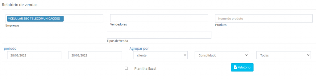 3. O sistema ira exibir a tela de Relatórios de Vendas, onde é necessário preencher os filtros com as informações para a emissão do relatório.