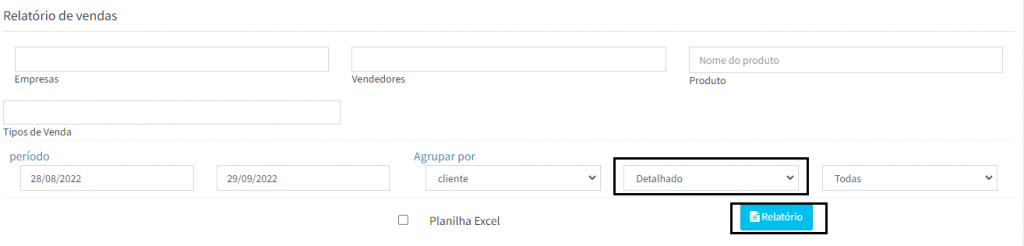 - Para gerar o Relatório detalhado, na página ‘Relatório de Vendas’, selecione a opção detalhado.