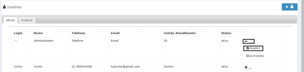 2. Em seguida role a barra de rolagem até o final da pagina na opção Usuários. Na tela listagem de usuário são listado todos os usuários cadastrado, busque o usuário que deseja alterar e clique no ícone com sinal de + seguido de acessos.