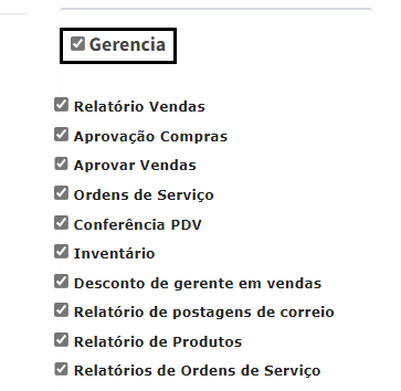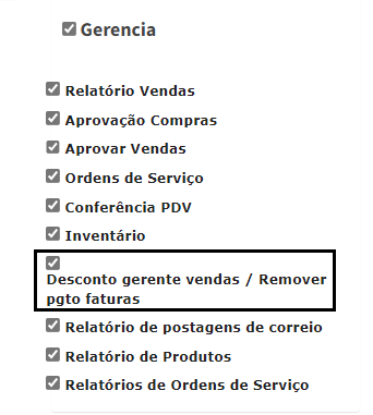 4. Para o usuário conseguir fazer a exclusão do pagamento na fatura após ser inserido, a opção ( Desconto de gerente em vendas/Remover pagamento na fatura) precisa esta marcado, se esta permissão não estiver marcada o usuário não consegui alterar o pagamento, somente com a senha da pessoa que tem está permissão habilitada.